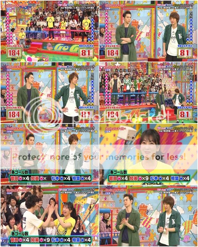 這隊玩的沒那麼好其中一個原因是……兩位神射手太厲害了啊!!長末一直把人家的飛盤射下來啊。最後130分好低分的結束了。伊藤桑總結山田君有傳了5枚,但是桔平桑只傳了一枚。桔平桑狡辯『果然還是要站到20分會比較好呢。』現在才想也太馬後炮了!哈哈哈!太遲了喲。翔也稱讚了兩位神射手。雅紀吐槽利達說現在表情和開始玩遊戲前完全不一樣了。