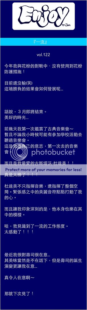 雖然J一直這樣有充裕的時間增進音樂方面的靈氣,但是我更希望J可以趕緊有戲劇上的演出機會。各種方面來說,適當的休息和適當的工作量是最好的。