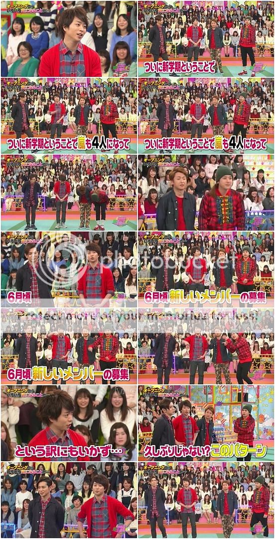 說的是呢!新學期我們嵐變成4人了,還請各位多多指教。門把全員鞠躬!喂喂!!不要鬧了!翔好壞的說『6月開始我們會募集新門把。歡迎大家來報名(做了請打以下電話號碼報名的動作)。』NINO和利達也附和的指了那個隱形的電話號碼。還是我們J比較好!!對你的第五位門把最好了!!J說到這樣的開場不是很久違了嗎?說的是呢!去年也發生過的,今年新一季我們的可愛陽光男要帶隊來了!