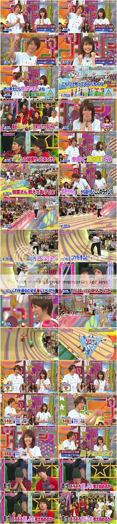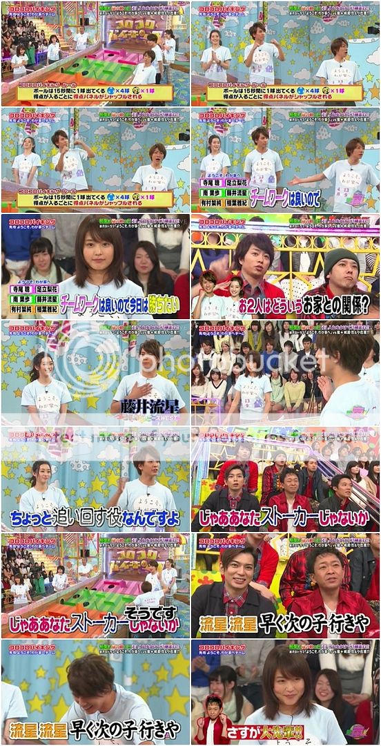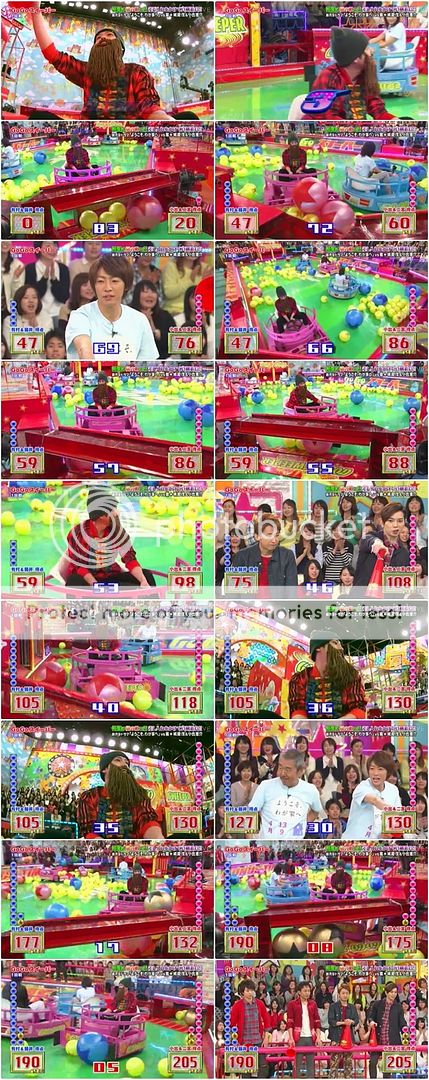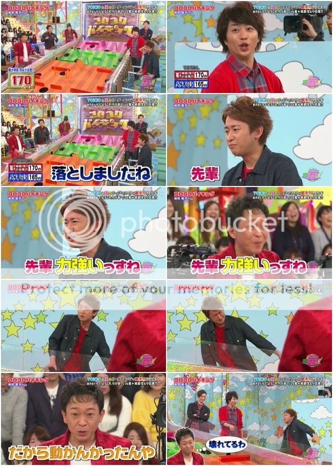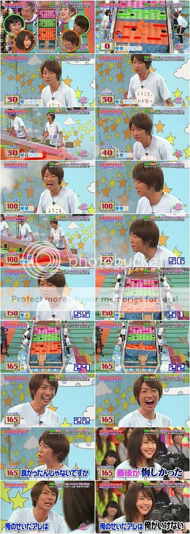 翔說有村醬最近來這裡的速度變驚人了,之前是3月來的(為映畫)。那這個遊戲有玩過嗎?有村醬說這是第二次。翔『那還算是新手呢,就請相葉桑來教導一下。』(你好會cue你家雅紀啊你!)我說雅紀,你的教導方式還真是實際啊!!直接就當自己是球,因為有村醬站那邊,所以就讓有村醬沿著某條線一直到粉色的星星圖案那裡,這樣照理來說就會往紅色瓶子去。這時候城島利達抗議了『你也早點說啊!我都不知道啊!』哈哈哈哈哈!!!!城島利達找時間點插話太強了啦!!さすがリーダー!!