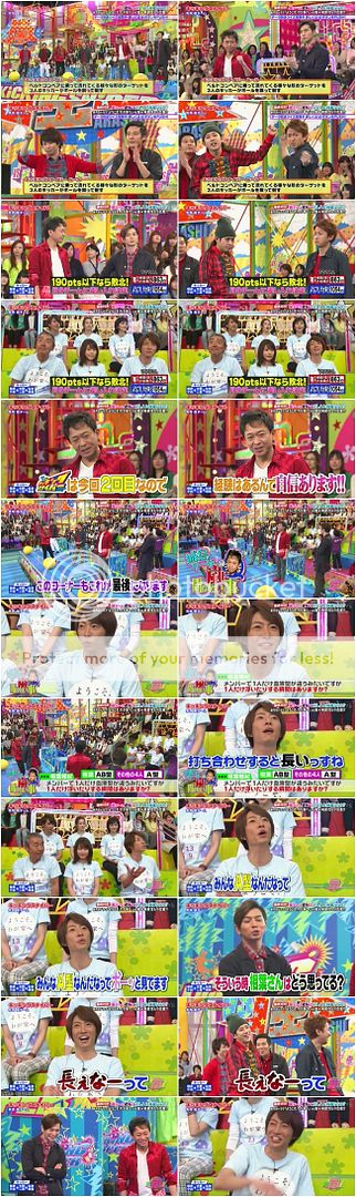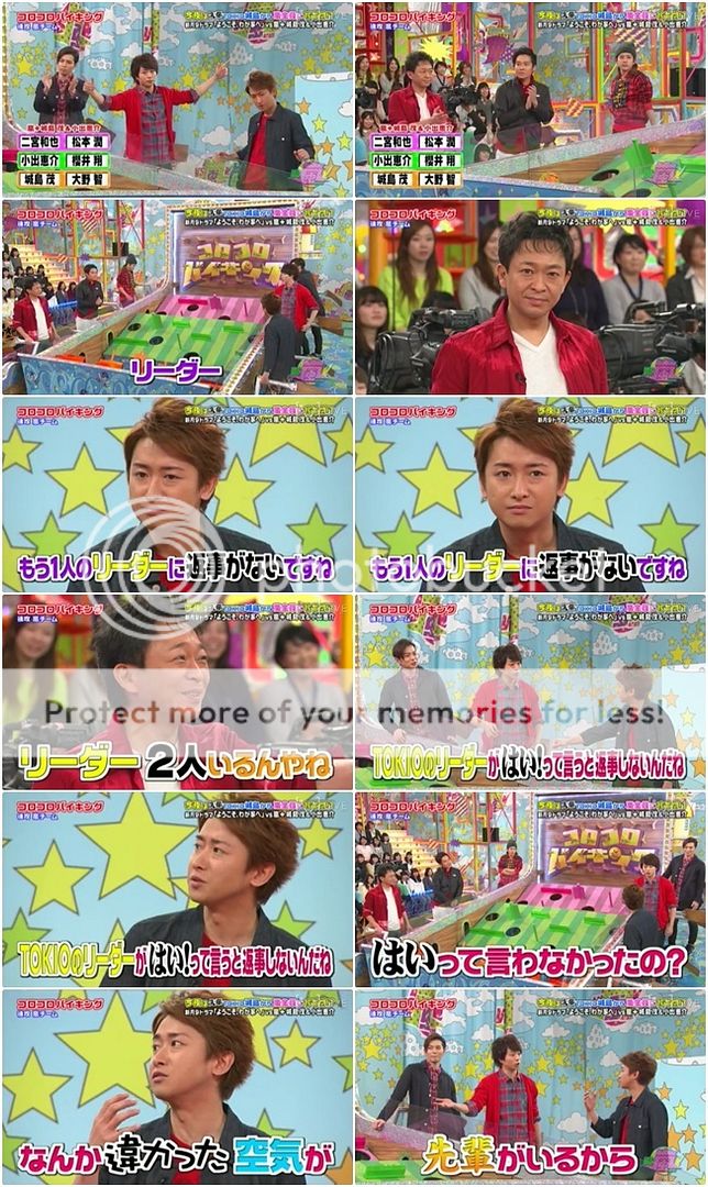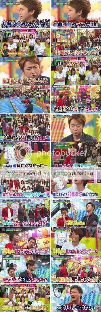 雅紀故意冷嘲『這樣的嵐還真沒看過呢。那不如這樣好了,你們說如果我們得多少分你們就買禮物來多探一天班。』翔『你這是在對大家挑戰嗎?』J『那就300點。』翔『那就超過300分吧。』J想了一下『這樣對我們越來越不利呢。』城島利達『我知道了,既然今天我一直在扯後腿,那如果超過300分多出的一天禮物就由我來買單。』