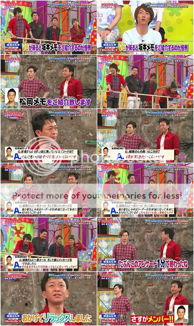下來時,翔問了城島利達『那裡是發生什麼事?(台場手指)』然後我們NINO寶貝就好可惡的學人家前輩在手指那裡的掙扎的動作笑死我了。但沒想到卻被城島利達的冷笑話扳回一成(這裡有點難解釋城島利達的冷笑話點,就是讓NINO不要作為投訴者的身份來說攀岩者(日語能力還沒好到可以了解押韻的笑點。笑)。NINO被擺了一道敲腦袋的動作可愛爆了!!