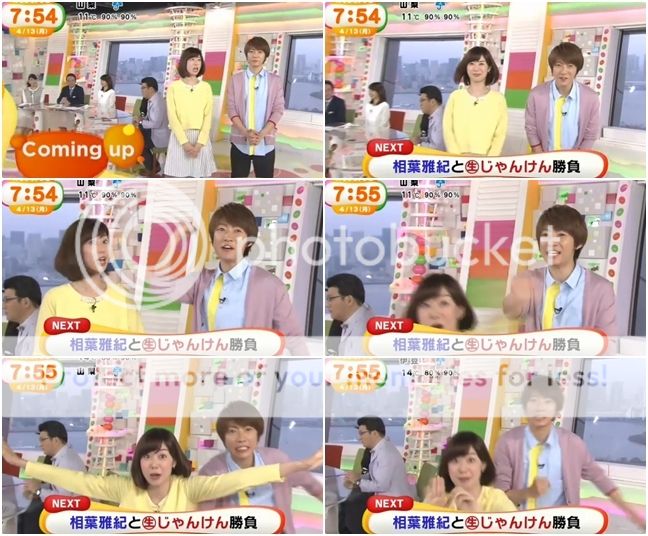 MEZAMASHI固定的就是要來和電視前的廣眾來剪刀石頭布。主播cue了說下一段要來和雅紀進行,但是雅紀卻調皮的立刻就要來玩剪刀石頭布了被主播立刻阻止。哈哈哈哈!!真的很愛鬧主播耶你。