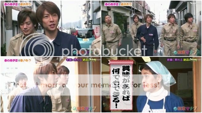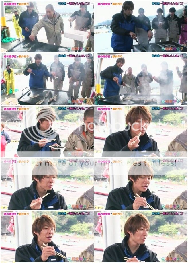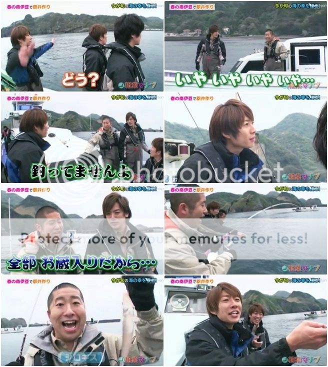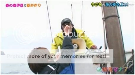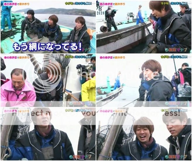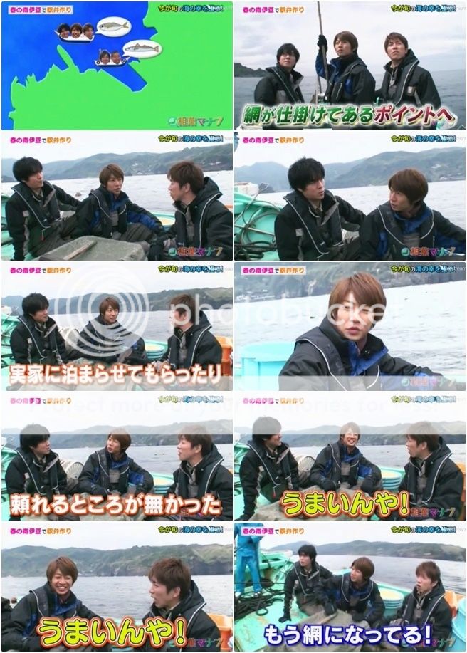 結果出海之後,船長說他們是以撒網的方式來捕捉魚,所以趁著還有時間,雅紀和兩位關八團員開始敘舊起來了。說到第一次見面的事,然後村上君也提到以前會寄宿在雅紀的老家,丸山君就說雅紀家的飯超級好吃的。那是當然的啊!!雅紀家可是料理世家啊!!雅紀媽媽的料理也是一流的呢。