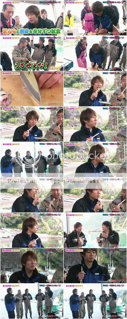 然後開始試吃生魚片。雅紀也是整個說好好吃好甜!!好適合拿來做生魚片。關八就開始說那應該要全部拿來做生魚片的,早知道就不要炸成天婦羅了。又在鬧澤部桑。