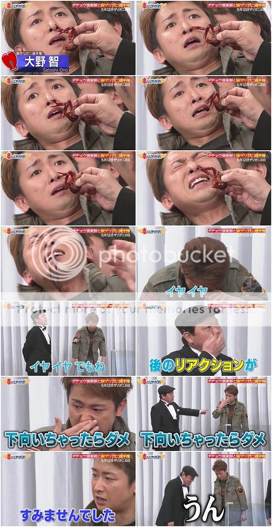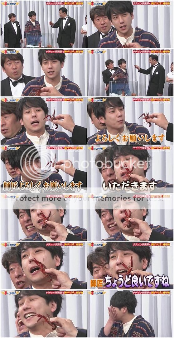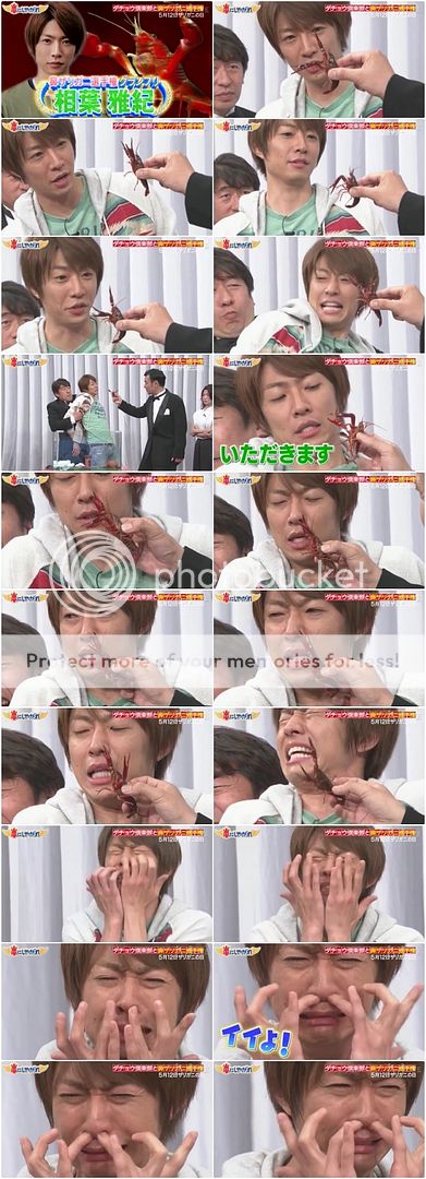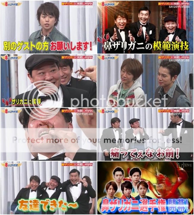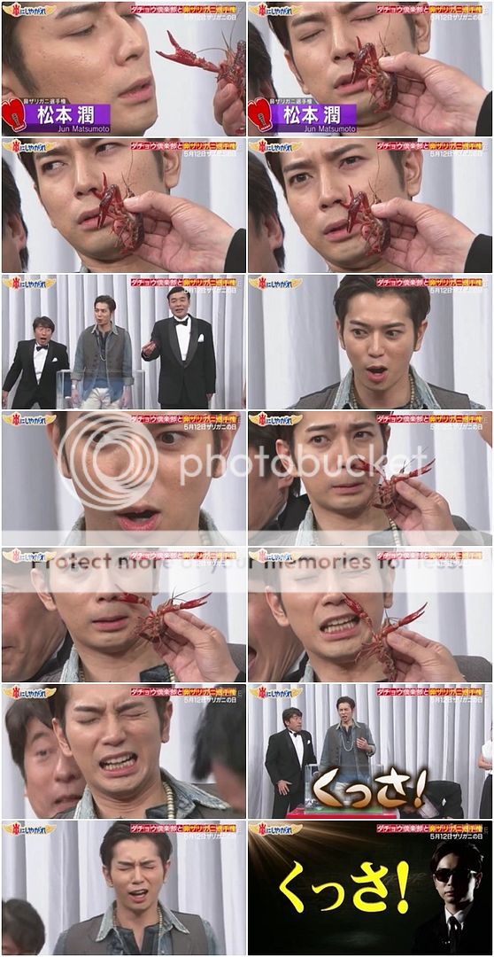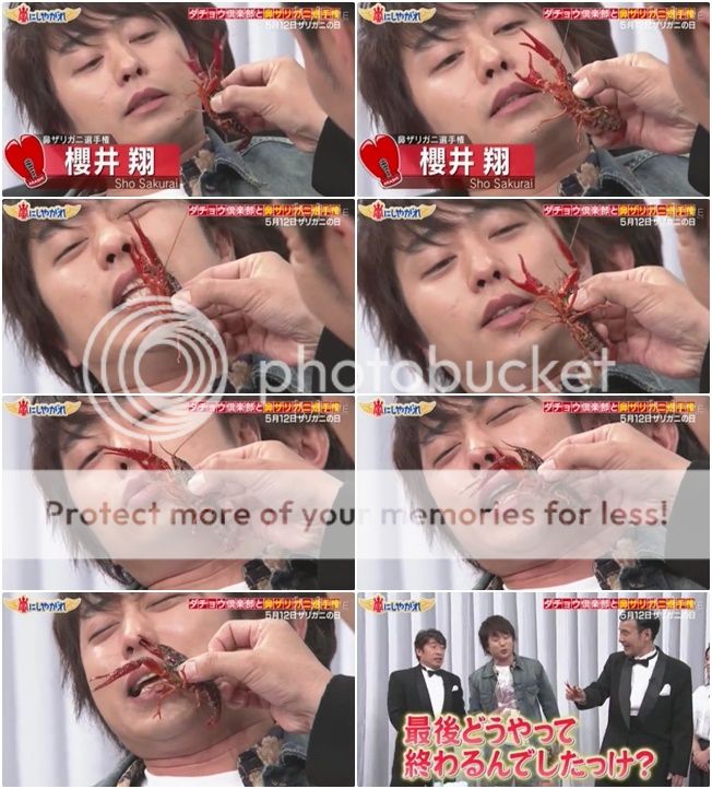 雅紀也是閒給小龍蝦打招呼,然後他被很鬆懈的夾住。小龍蝦真的就夾了雅紀的鼻子,雅紀被夾完整個一直在搓揉自己的鼻子,表情好像要哭出來了,塞住自己的鼻子。我想這代表不是痛,而是真的很臭!