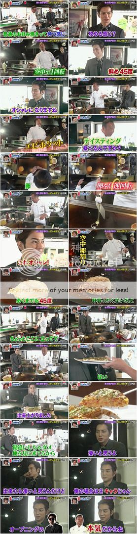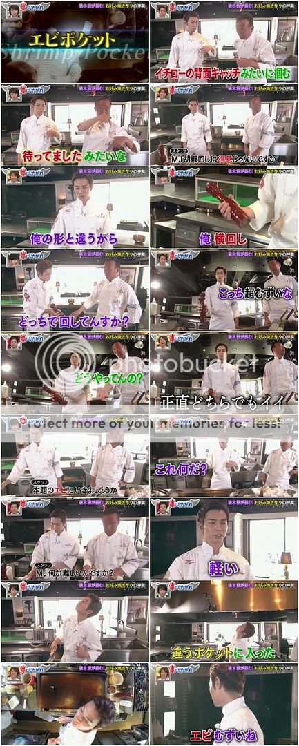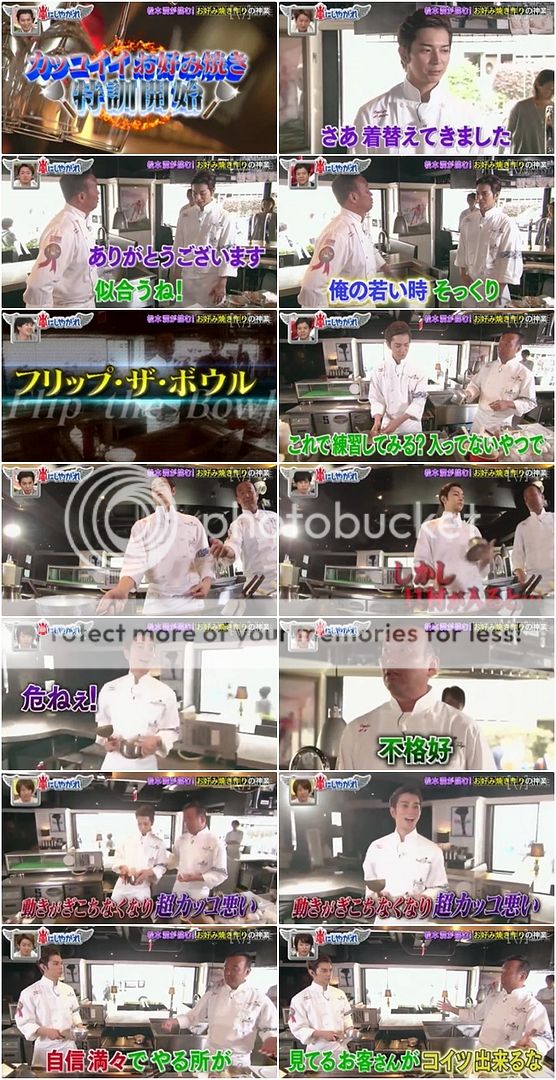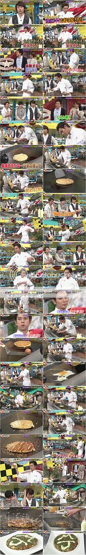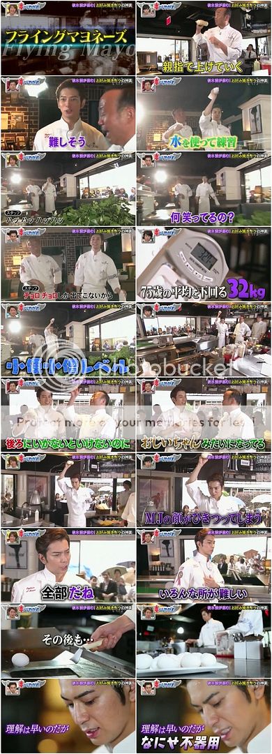 再來就是打蛋了。先是在鐵盤上旋轉那個蛋,但是沒對準,所以蛋在鐵板上到處跑被NINO笑了。但是還是勉強的把雞蛋放到鏟子上,然後一個往上拋,成功用鏟子打破雞蛋了!但是還是有蛋殼殘留在那裡所以後來J還是作弊的把蛋殼拿掉。最後是在お好み焼き上撒上醬汁。磁石好壞心的學J那個按醬汁的姿勢。