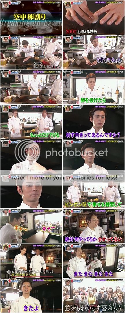 接著是打蛋,開始要先在200度高溫的鐵板上旋轉那個蛋。這個當然不可能一下就成功,所以主廚讓J在路人面前用乒乓球來練習。最後一次J成功打到乒乓球了,路人們大聲KYA的鼓掌。哈哈哈!