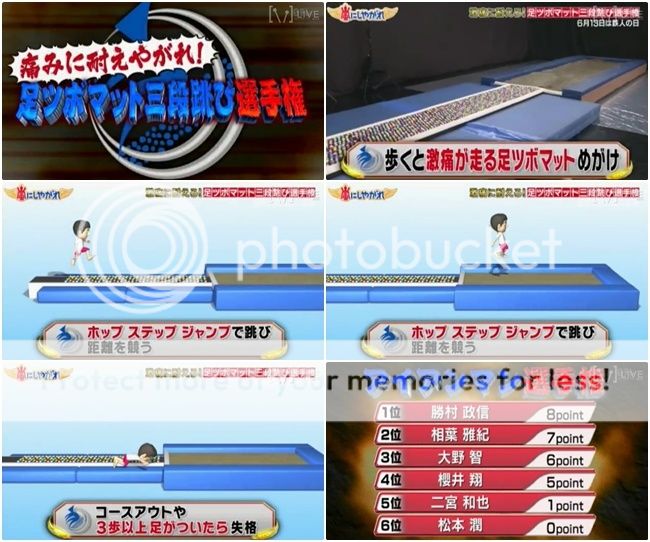 最後是來結束今天的鐵人選拳。最後一個對決就是要在腳底按摩步道上跳然後彈起來跳遠。看誰能不在那個腳底按摩步道上就直接失敗。最後取跳最遠的為優勝。目前是勝村桑第一名,雅紀緊接在後。