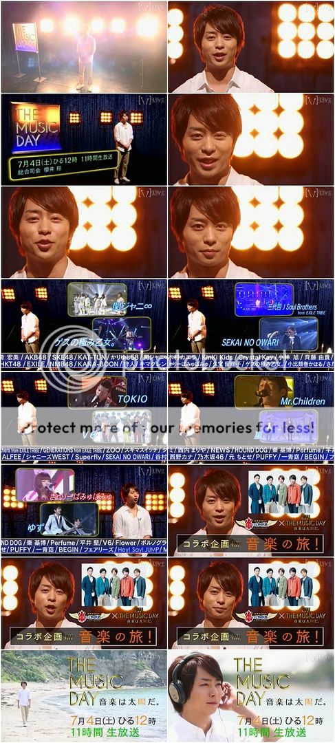 今晚最後THE MUSIC DAY總司會大人來給大家愛報告一下今年出席音樂番組的嘉賓。J家幾乎全員都到齊了,有關8、HEY SAY JUMP、NEWS、KAT-TUN、TAKKY&TSUBASA、KINKI KIDS、V6、TOKIO~當然還有我們嵐咯~今年還會有嵐にしやがれ&The Music Day的特別企劃音樂之旅。