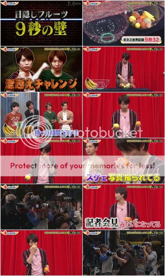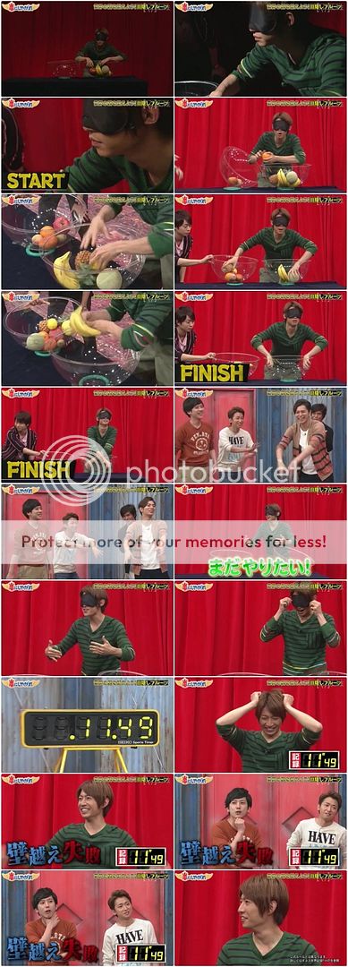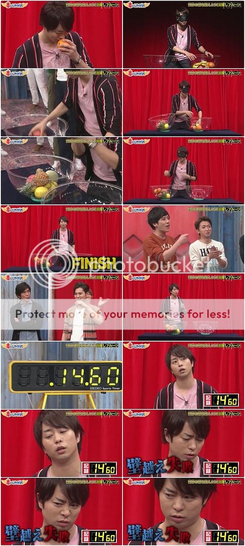 雅紀果然很厲害!!橘子和葡萄柚也都沒有拿起來嗅啊。不過動作太大所以另個碗都要被他打翻了,翔立刻飛奔過來幫他扶住碗。多貼心的夫君啊~雅紀速度肯定比翔快。最後還很有餘的在碗裡摸來摸去的表示還有沒有啊?門把全部在旁邊學雅紀的動作。NINO『看起來還可以挑戰更多。』雅紀『還能繼續啊!』那到底破紀錄沒?我也覺得雅紀會破紀錄的啊但是殘念非常可惜拿到了11秒49的成績。懊惱的雅紀~不要抓頭髮啦。會禿頭。