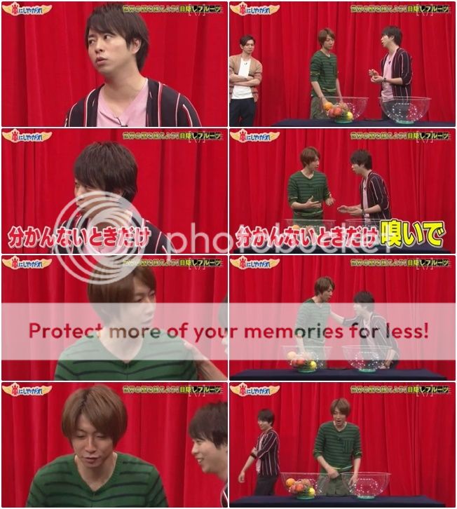 首先是翔。翔說最困難的就是來分辨出橘子和葡萄柚。翔一拿兩個水果上來聞,外頭記者們就咔嚓咔嚓的拼命拍照。J『相片拍的好瘋狂啊!』翔自己也自豪起來的說『就像是記者會一樣。』哈哈哈!!就只是翔愛嗅橘子是有多好拍啊?哈哈哈!