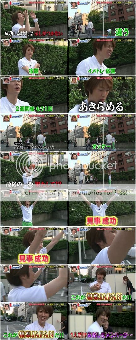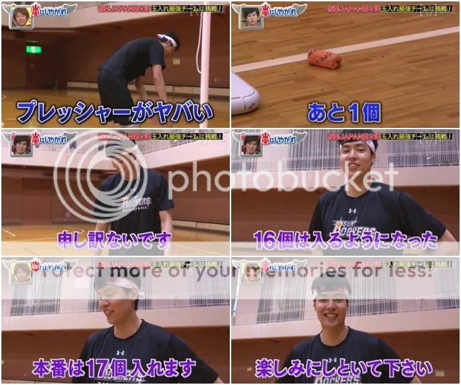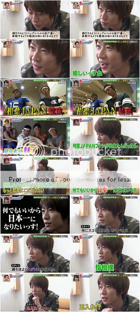 似乎有觀眾反應說之前相葉JAPAN那個拔河比賽真是太厲害了,看的好感動所以希望雅紀可以來第二彈的相葉JAPAN(NINO小窗口:騙人的吧!)。雅紀『好開心啊!(被說對相葉JAPAN很期待)』(小窗口的J:這是節目效果啦!)雅紀整個信誓旦旦的說無論什麼都好,想要成為日本第一啊。staff桑表示這次的挑戰比拔河還要嚴苛。雅紀搞笑啊你!!!雅紀『難道是手指相撲?』staff桑(冒冷汗)說這次是投小球。