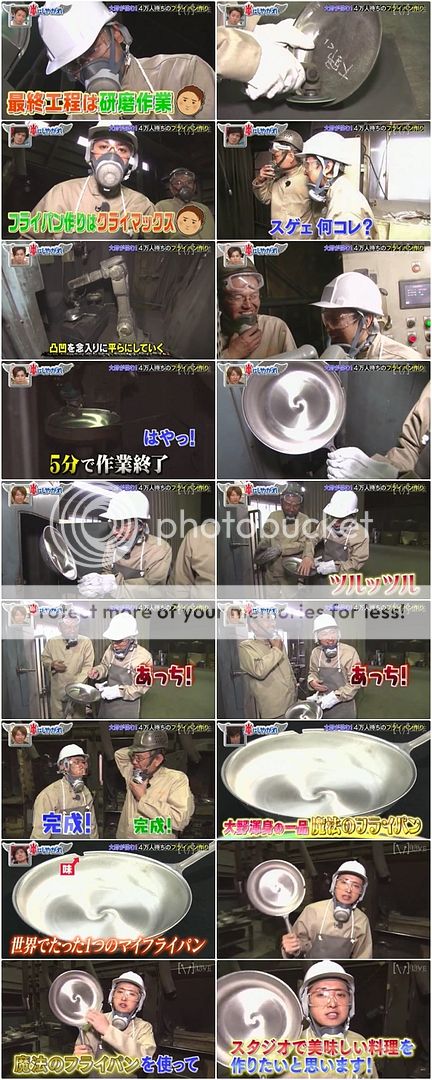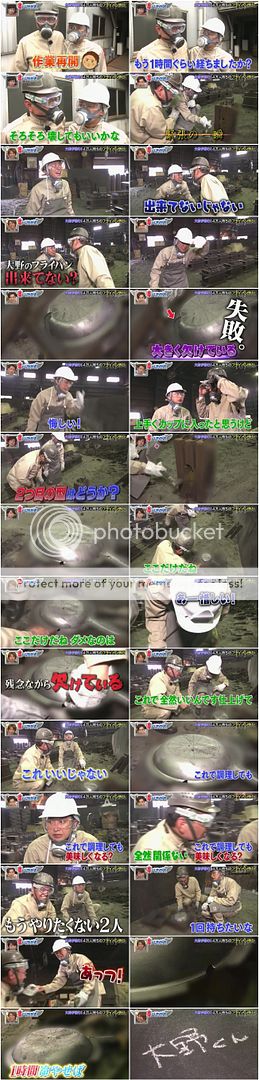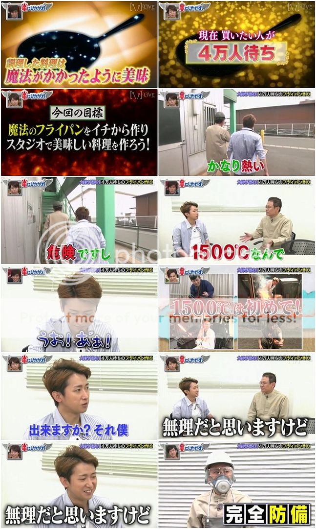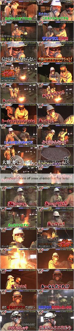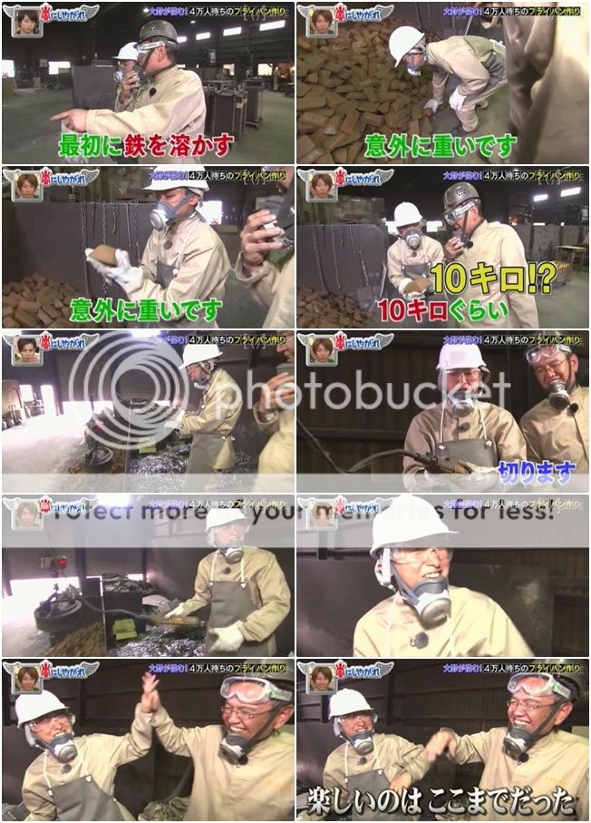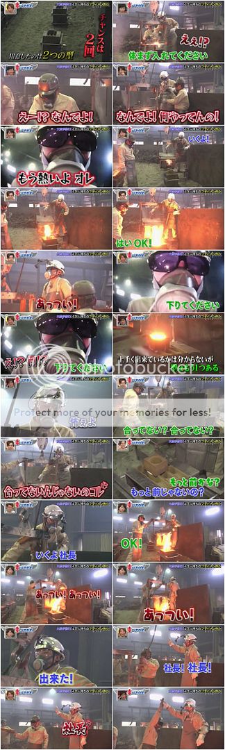 這裡主要就是要利達在1500度高溫的情況下來燒鐵讓他們溶為製作炒盤的鐵液體。原本沒戴墨鏡,利達連眼睛都打不開。我說社長你自己倒是戴的很帥嘛,一開始就給我們利達戴上啊!!結果戴上全副武裝還要被staff桑吐槽不知道到底這些服裝下的人是不是大野智。哈哈哈!這裡就是一直看到可愛的あついあついあつい了。真的好燙啊!!這是第一次直接到1500度高溫來製作東西啊!!一次比一次挑戰更高溫度啊我們利達。