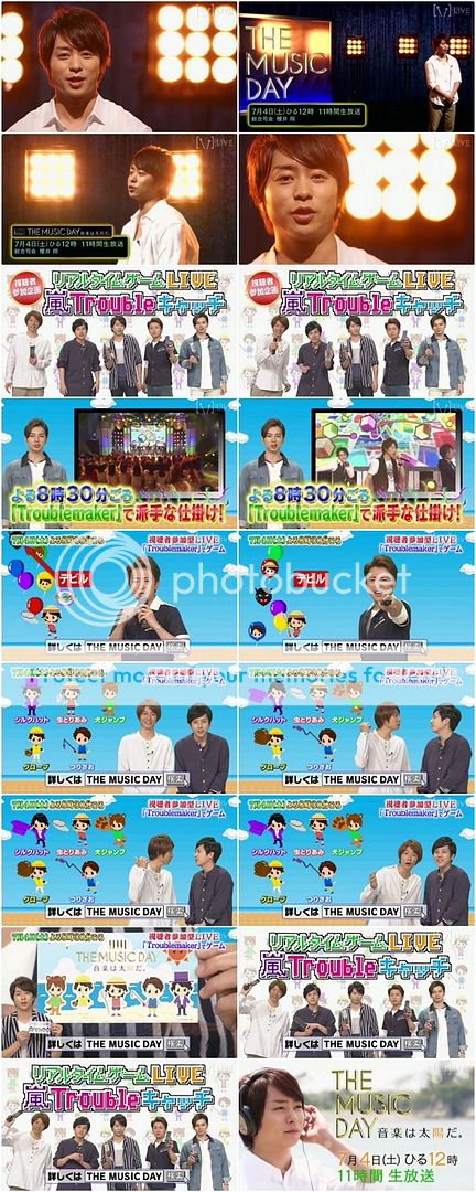 再來是7月4日的THE MUSIC DAY。當然每年定番一定要有的就是THE MUSIC DAY之リアルタイムGAME!今年是嵐Trouble Catch!所以顧名思義就是要跟著「Troublemaker」歌曲來進行遊戲解救受難的嵐公仔咯~!