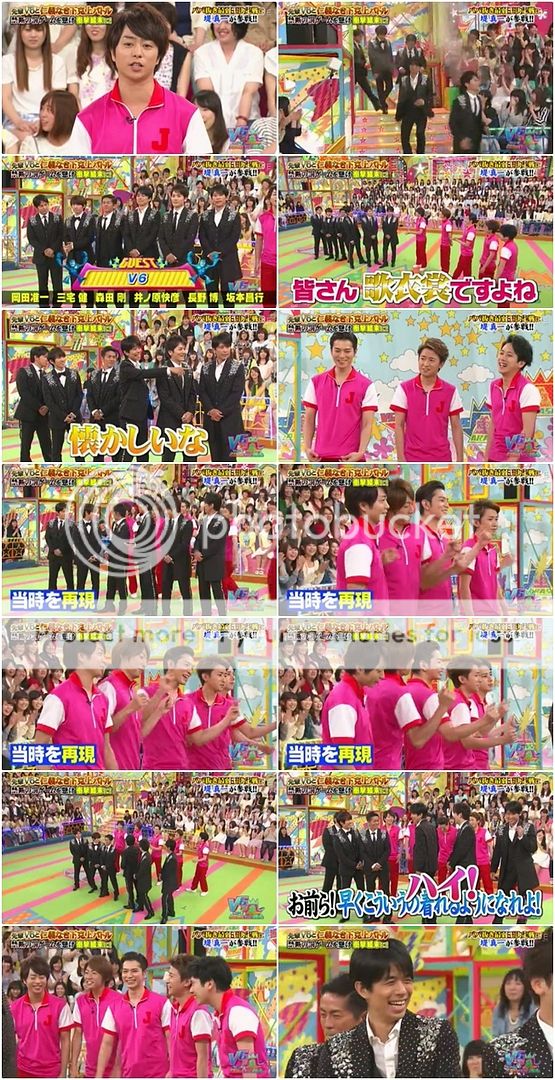 請出前輩們!!好帥啊!!!穿了舞台裝出場啊!!井之原君看嵐都穿上當年的衣服一直說好懷念啊~~於是嵐就走到了V6身後去。啊啊啊!!!真的是當年那個畫面啊!!!你們今天真是碰上V6就整個好活潑啊!!在後頭一直在搖擺著。