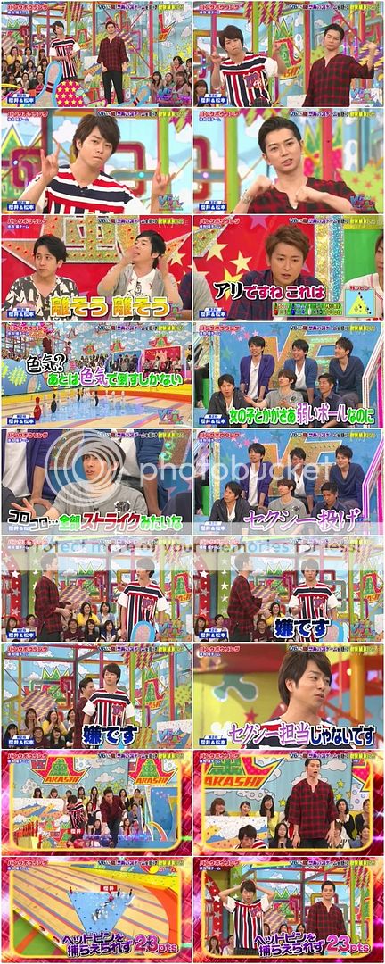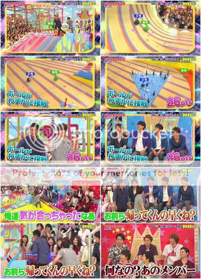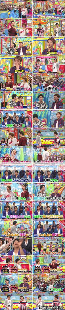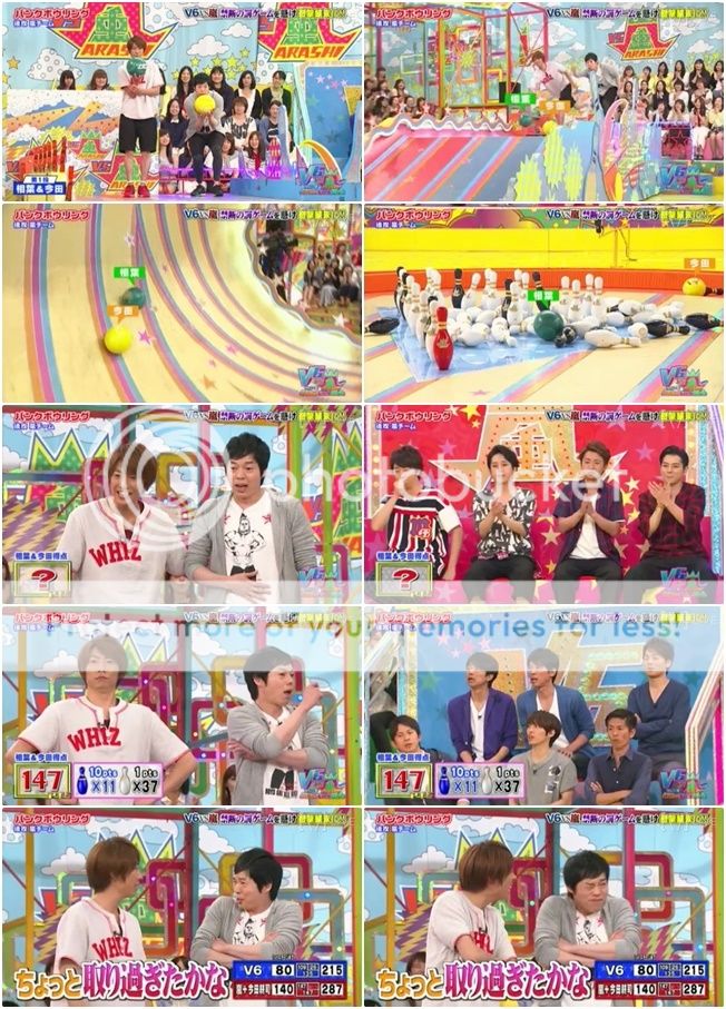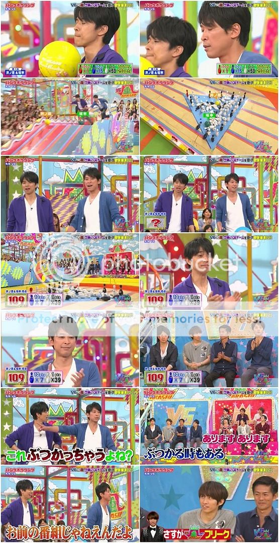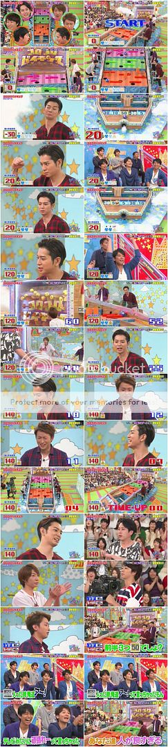 不過之後J的領導實在是太好了!!cue了今田桑配合他,就陸續一直往50分裡送了。可惜還是有把一顆球送進負分格子裡,但是也都已經超越了前輩們的分數了。之後黃色小球出來,在山組的綠色區那裡就一直沒再往下,因為怎麼搞的啊!球一直被吸進那個綠色區的洞裡啊。哈哈哈!!山組就噴笑出來了。(利達那怎麼搞的莫名其妙的表情好可愛)J就在橘色區那裡一直在等但是小黃球就是沒下來呢。結果140分結束。V6前輩們真是一直不斷在幫嵐加油啊。好可愛的前輩。