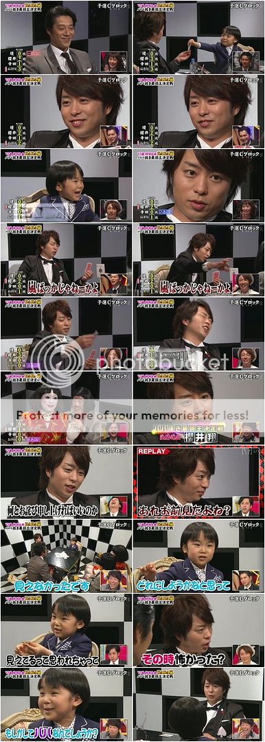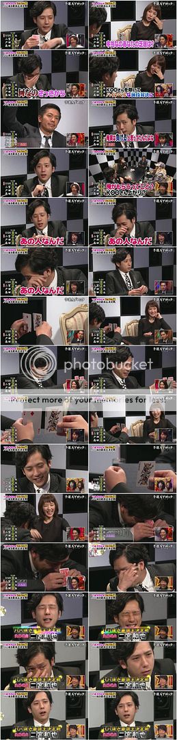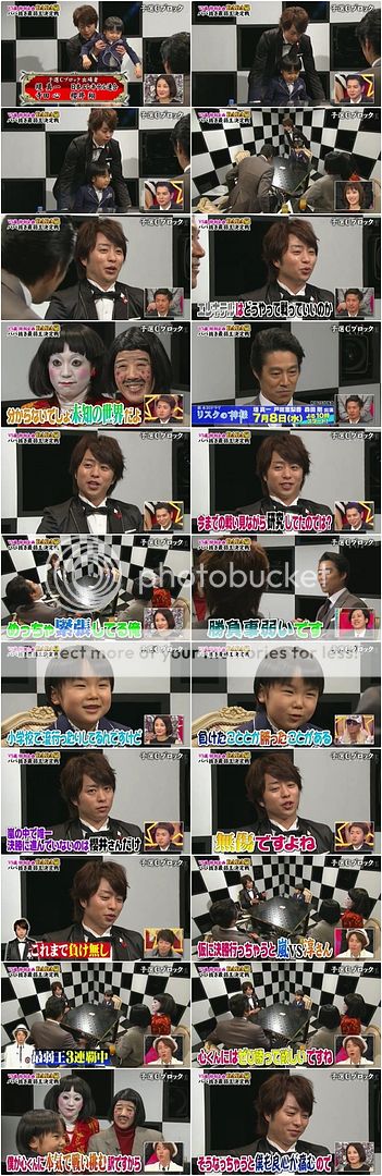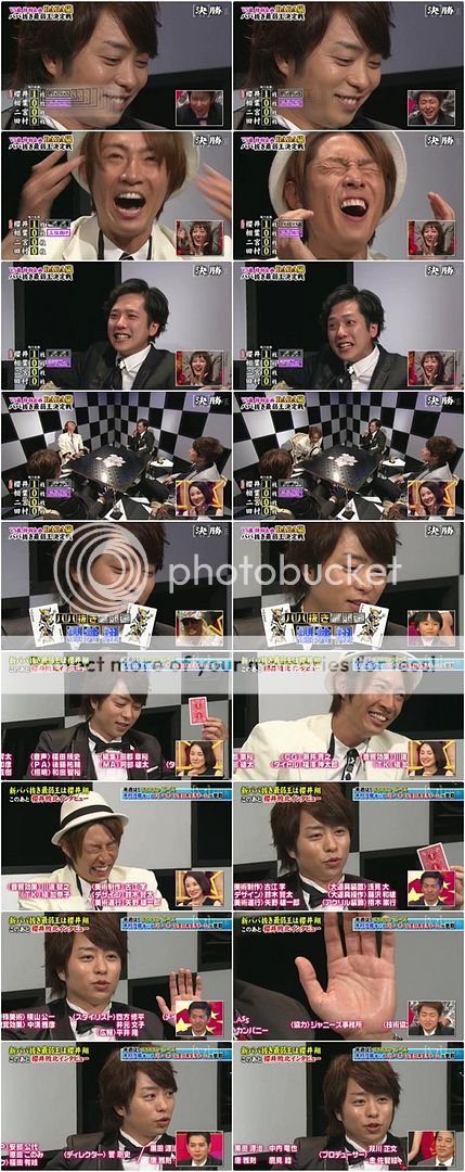 翔笑了出來,好心虛。雅紀指著翔表示原來在你這裡啊!翔『你這傢伙真的一直一直都不抽走!!』雅紀好緊張的倒在椅子上要哭了啦!!眼睛泛淚了。我說櫻井翔你給我讓雅紀贏啦你!!哈哈哈!!