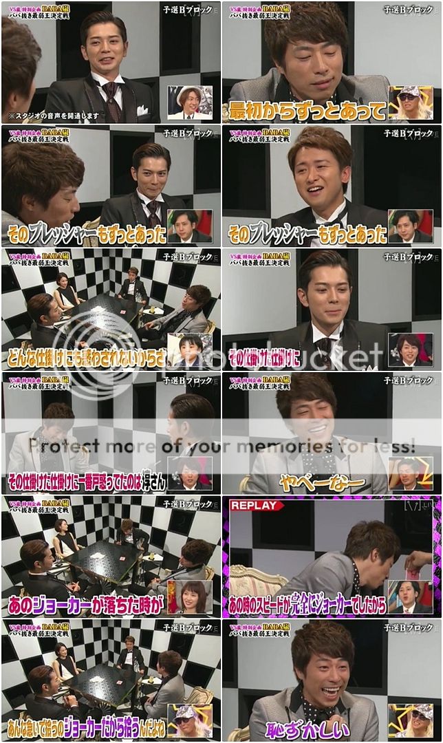 問雅紀覺得這個block的人如何?他說吉田桑應該到現在都還沒發現誰握有鬼牌。NINO吐槽雅紀『那如果是相葉桑是不是會發現?』雅紀『瞬間就會發現的。』