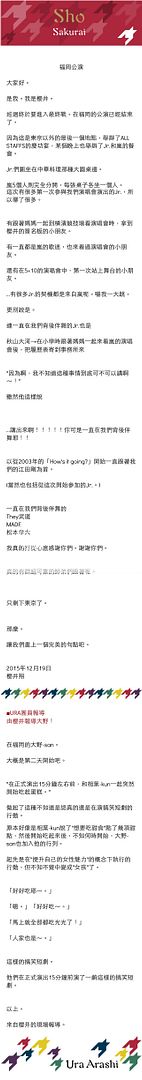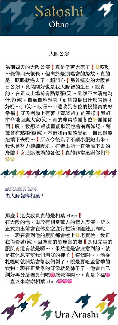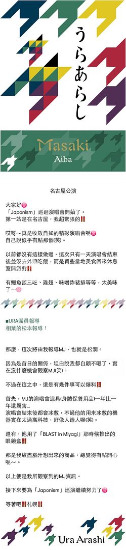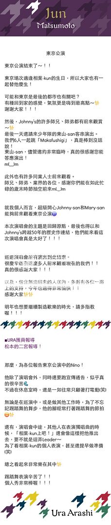 基本上翔的報導就是和在福岡現場mc時候說的內容一樣。我期待已久他和雅紀猜拳猜到在一起mc怎麼知道說的都是Jr的事,雖然有點可惜但是還是好羨慕可以拿到他簽名和最近站在自己偶像後面伴舞的Jr。你可是有五位非常棒的先輩喔!