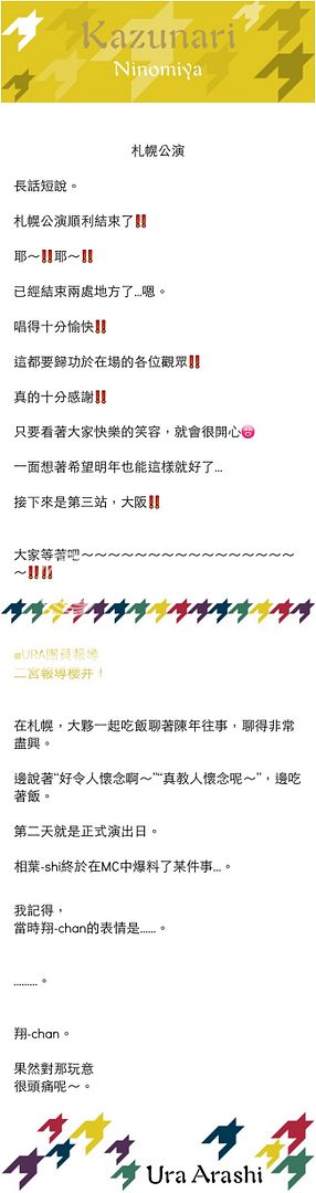 在札幌時候翔要移動到後舞台時候需要在移動舞台上脫掉外套,這時候剛好移動舞台在後舞台停住,剛好停頓的力道有點大鎮得翔抖了一下。大概是那時候開始他的惟高開始發作。怎麼知道這時候雅紀卻從後頭來撞他一下於是………………有人………………臉青唇白…………惡狠狠的瞪了雅紀。哈哈哈!