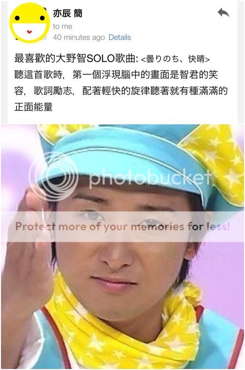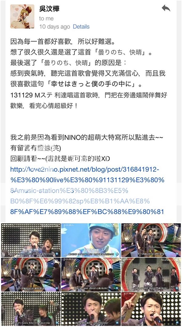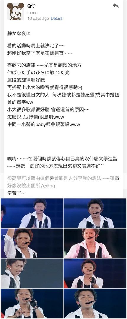 謝謝利達每次的表演都會帶給我們很多震撼,舞蹈這麼的棒,編的舞蹈足以累壞門把(笑),唱歌這麼的好聽,高音那麼的洪亮!在現場聽大野智唱歌簡直是一大享受!