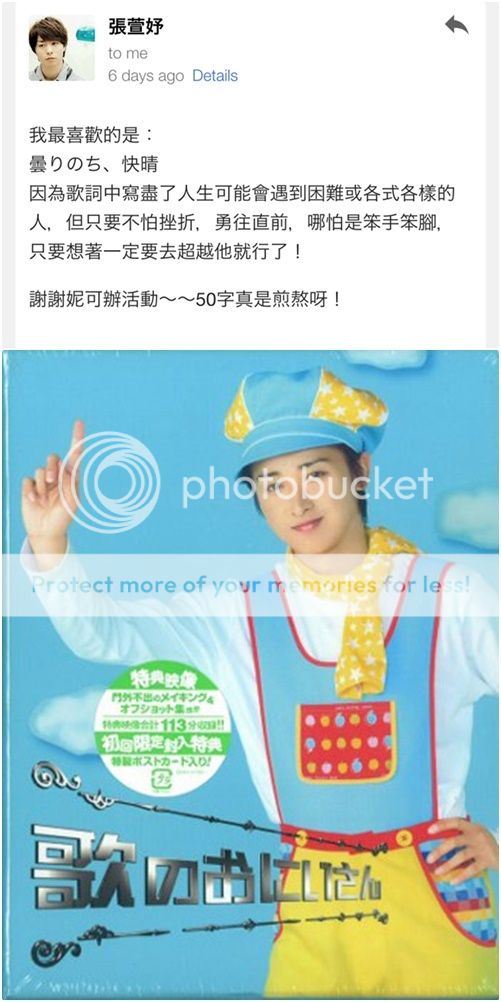 這次主要有兩首歌好多人選擇,第一首就是歌のおにいさん的「曇りのち、快晴」(很不好意思妮可心目中最愛的歌並不是這首哦雖然這首好可愛)