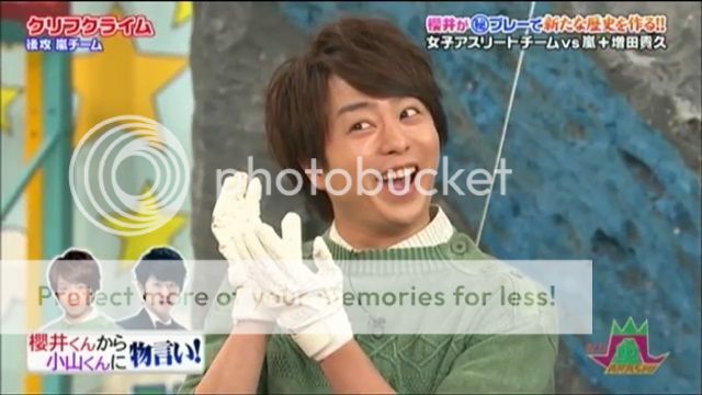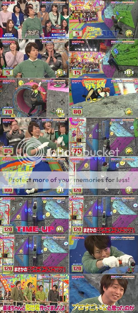哈哈哈哈!!我簡直要暈了。增田你今天是來胡鬧的嗎???說的信誓旦旦但是才剛開始就差點掉下來了是怎樣啊!!然後到底在哪個岩那裡掙扎什麼啊!!剩下12秒時間給翔,而且還是放棄的掉下來。翔想快速上去,但是剛好電梯的把手整往上走。哈哈哈!!於是乎…………我們櫻井翔這次又在破紀錄的在電梯那裡…………掛著結束了!!!哈哈哈哈哈哈!!!好殘念的表情!!而且還一直隨電梯這樣上下也太爆笑了!你還真是會耍梗啊!!