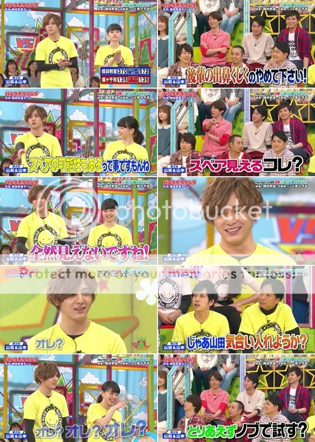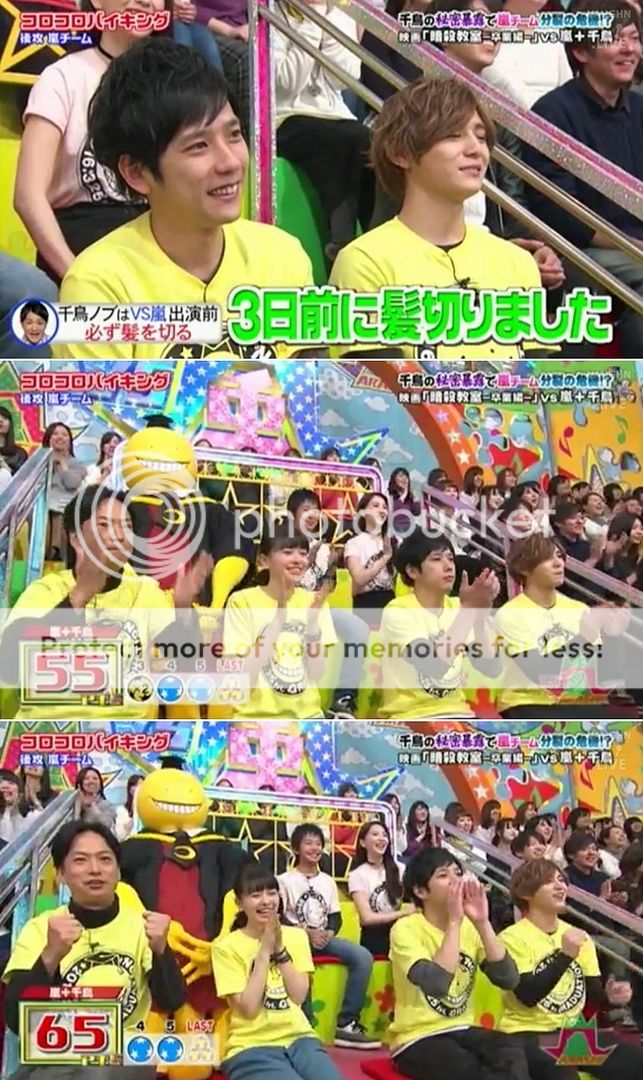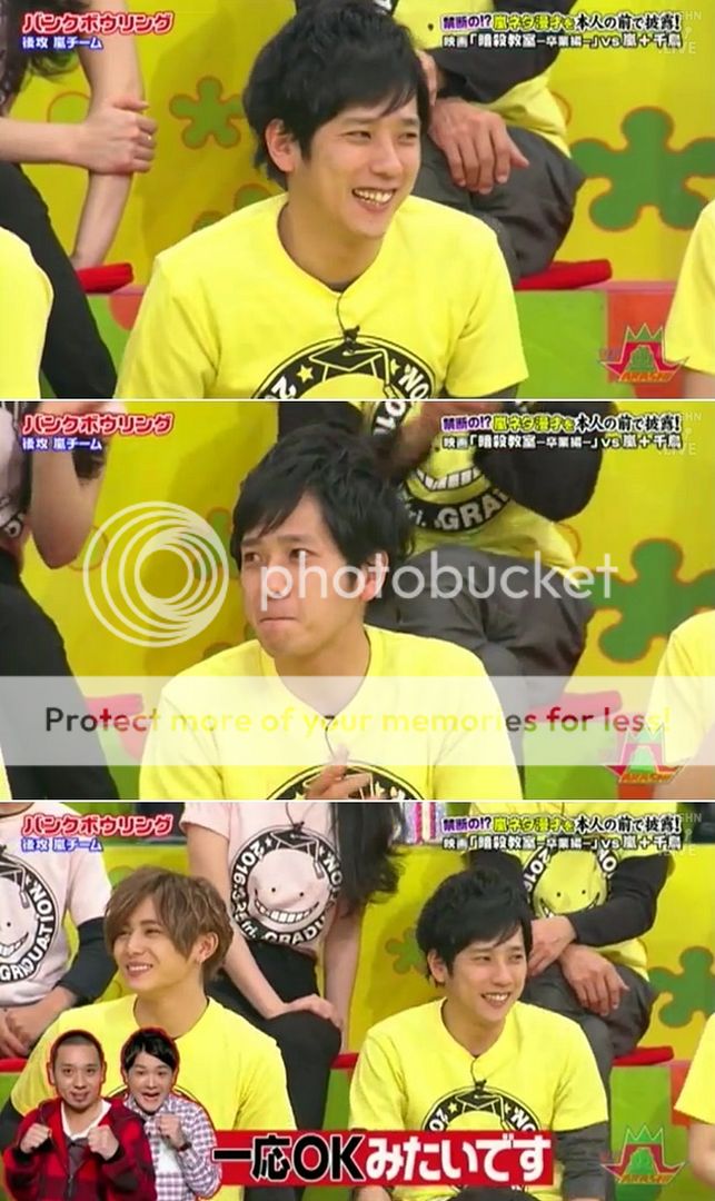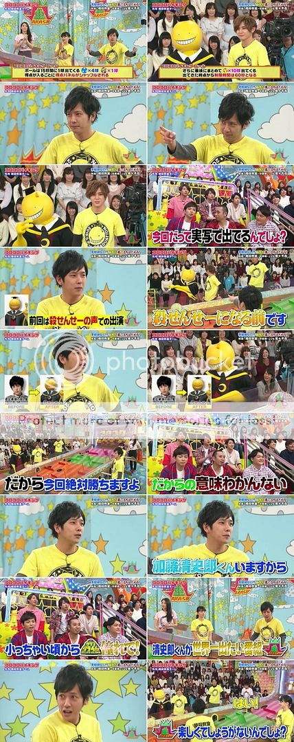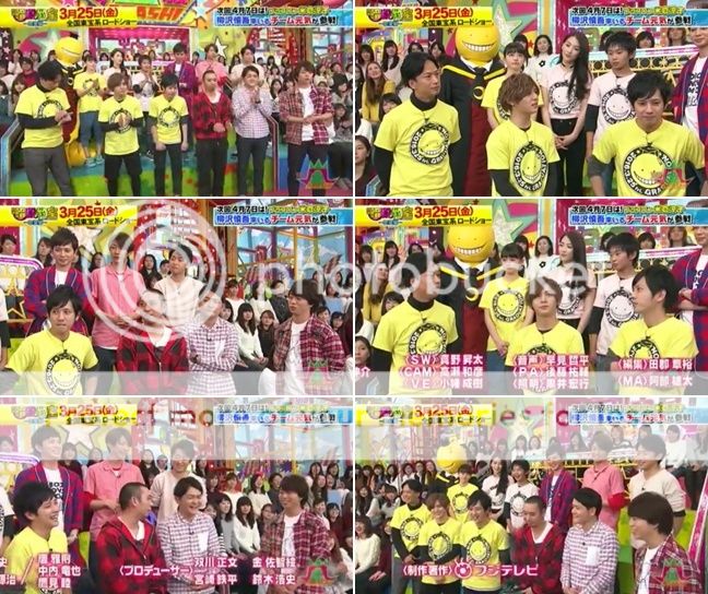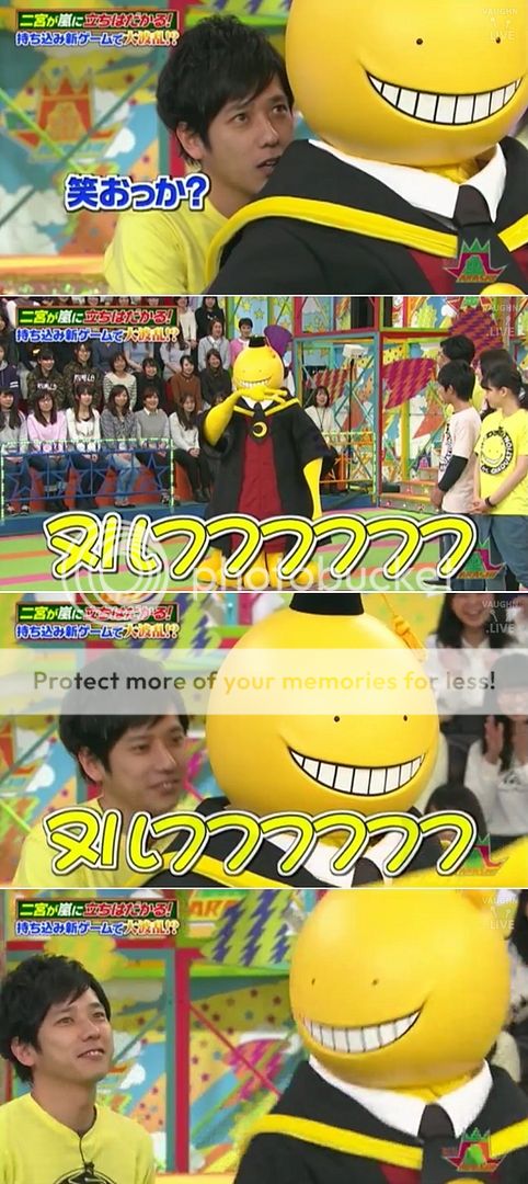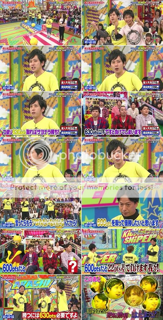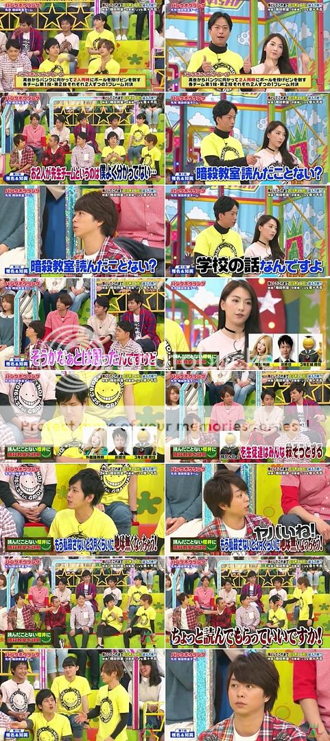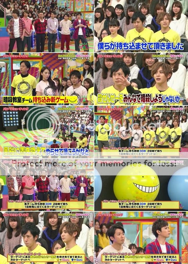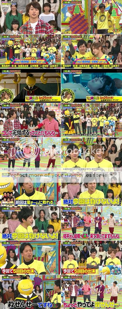 先是暗殺隊上場,派出兩位先生組。因為翔不解為何他說是先生組,所以桔平桑反問翔有在看暗殺的漫畫嗎?翔很老實的說沒在看。桔平桑解釋說故事是發生在學校他知道吧?然後兩位是在戲裡出演先生,然後另位先生就是殺老師了。J在後面補劇情說其他人是演學生,他們是要來殺殺老師的。NINO接著解釋說如果不殺了殺老師,明年的3月地球就會被毀滅。翔『這還真是やばい呢』大家你一言我一語在重新介紹劇情的感覺,山田君於是站起來對翔說『還請你稍微給我讀一下(漫畫)可以嗎?』哈哈哈!!残念~~我說你家後面兩位有漫畫啦,你趕快去跟他們借JUMP來惡補一下啊。