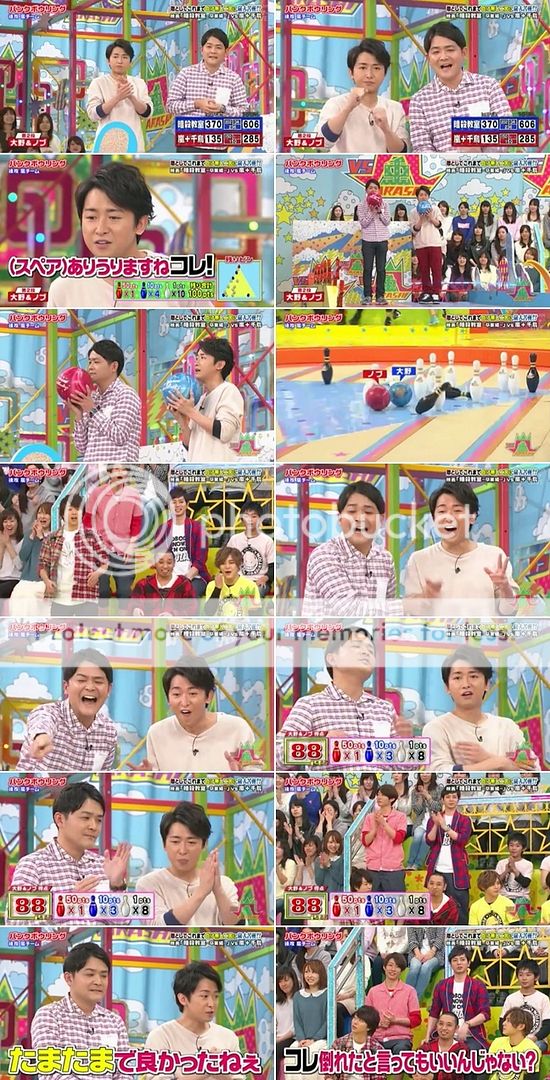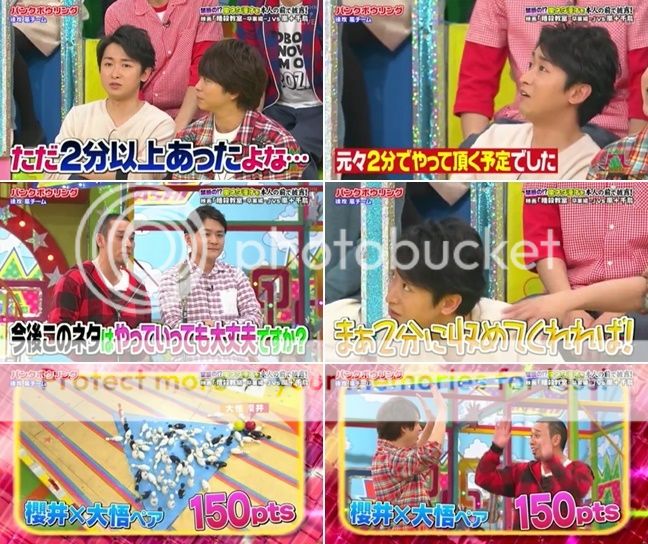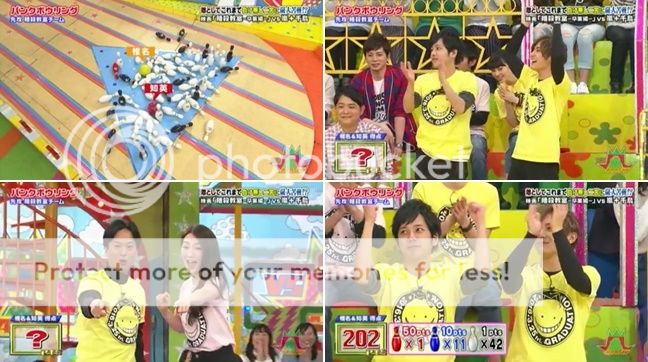 第二棒是社長和NOBU。這次非常有望SPARE呢。結果利達的球很準確的往紅色瓶子去了。那個在邊邊的瓶子也被打倒了,害櫻葉緊張的跳了起來還以為有望SPARE了。但是無論如何成績非常好。