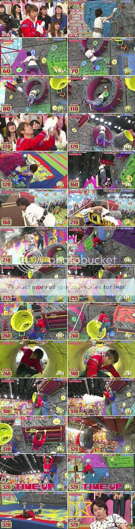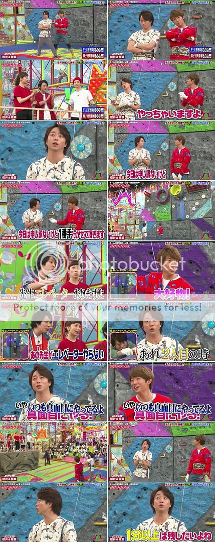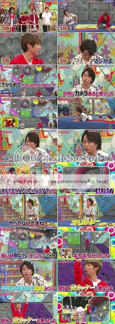 雅紀也是整個好緊張啊。和翔交換要攀岩時候升降梯已經下來了,所以雅紀要迅速的飛奔去追升降梯。還真被他追到了。我說雅紀你已經是輕到沒體重怎樣都能飛奔上去了嗎??整個輕如羽毛啊這個人。結果來到下巴那裡就來不及了(這裡已經不叫下巴但是我找不到更適合的形容詞了)。雅紀懂得放棄拿輔助把手試圖想以自己的力氣上去但是還是沒辦法啊。結果下來的時候整個太輕被飄到不知道哪裡去了,最後是正面朝下下來的。你就是太輕了才會這樣啊!!!