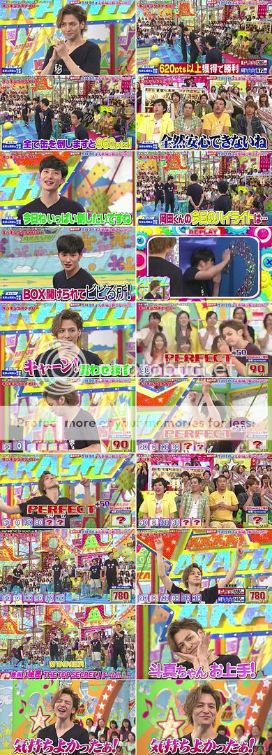 現在映畫組需要620分以上才能獲勝。而天音也說如果全部都PERFECT可以拿到960分所以翻盤機會很大。今天TOMA是神俯身啊!!!每個剩下的一個瓶子他都踢到了呀!!!而且都是很帥氣的直接踢倒。太強了!!!厲害到翔都要用敬語說TOMA好上手。最後當然是映畫組獲勝了!!恭喜!!