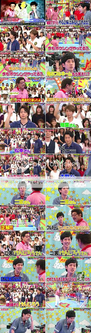 話說之前具志堅桑就把NINO的名字喊錯了,所以這次也要讓具志堅桑來說一下全員的名字。具志堅桑很快就說出櫻井、相葉和松本。來到利達果然每次都還是會把利達和NINO搞亂,不過也說出利達是大野,NINO是二宮。那來說一下NINO的全名吧。具志堅桑很為難的………………逼出一句………………けんじろう。哈哈哈哈!!!NINO『如果要說至少也要說金太郎吧。』然後門把就在旁邊一直鬧NINO,尤其是翔一直說『健次郎加油!』哈哈哈!!誰啊!!誰是健次郎啊!!