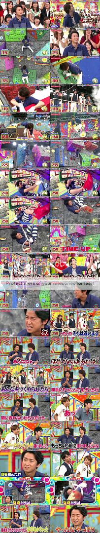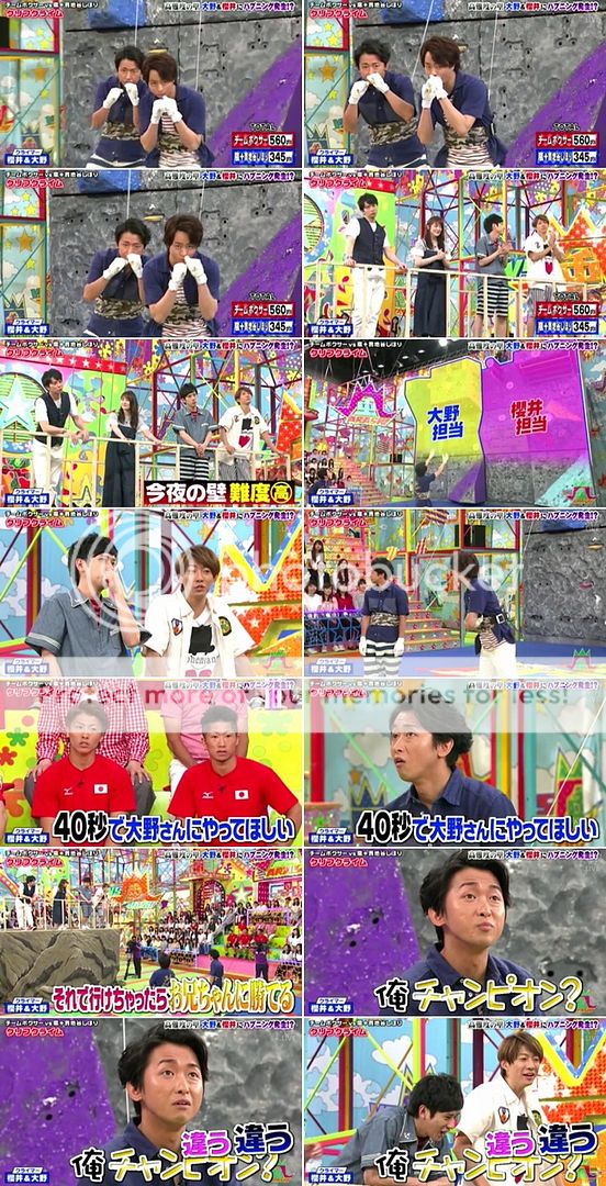 所以這是為了不讓選手們難堪所以山組故意放水???我眼中懷疑喔。首先是翔不知道是在跟牆壁跳舞還是怎樣,一直上下上下的不知道要幹嘛,然後還差一點掉下來。真是好險啊啊!!然後是利達到了最後一面牆的下巴那裡竟然都抓到把手了還在那裡故意裝作被把手那個繩子卡住手,拼命的甩手,然後就這樣甩啊甩的時間就到了。也沒能PERFECT 250分結束。我說大野智這不是平時的你啊!!!!平時多余裕的接把手,多快速的攀頂。所以啊,不能怪我懷疑你放水給選手們啊。不單我這麼想,連風組的弟弟們也這麼想的吧。J說根本是利達自己故意這麼做的吧。因為在聽到時間到殘念的音樂時候,利達就鬆開那個說是卡住的把手袋子啊。NINO『你是想做娛樂效果吧?』利達最後也承認其實中途好像就能把卡住的袋子去掉的。你果然是不想讓選手們輸太慘啊,很難看啊。只能說利達優しい?