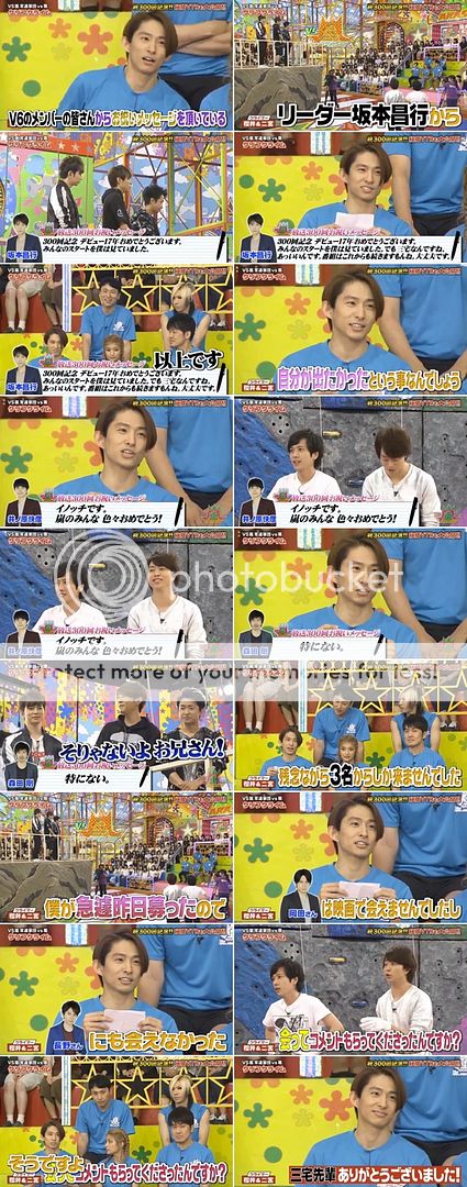 然後健君說V6其他門把有送來了message給嵐祝賀。先是很不服氣為何這期是健君來的坂本利達。然後井之原桑也只是說各種的恭喜。最後竟然有來自神秘的森田君的message,但是內容竟然是『沒什麼特別的。』哈哈!!好有森田君的風格喔!!然後其他兩位(岡田和長野君)都在拍戲昨天沒碰面所以健君沒能拿到他們的message。原來這個messages都是健君自己親自問門把拿的。好用心喔!!