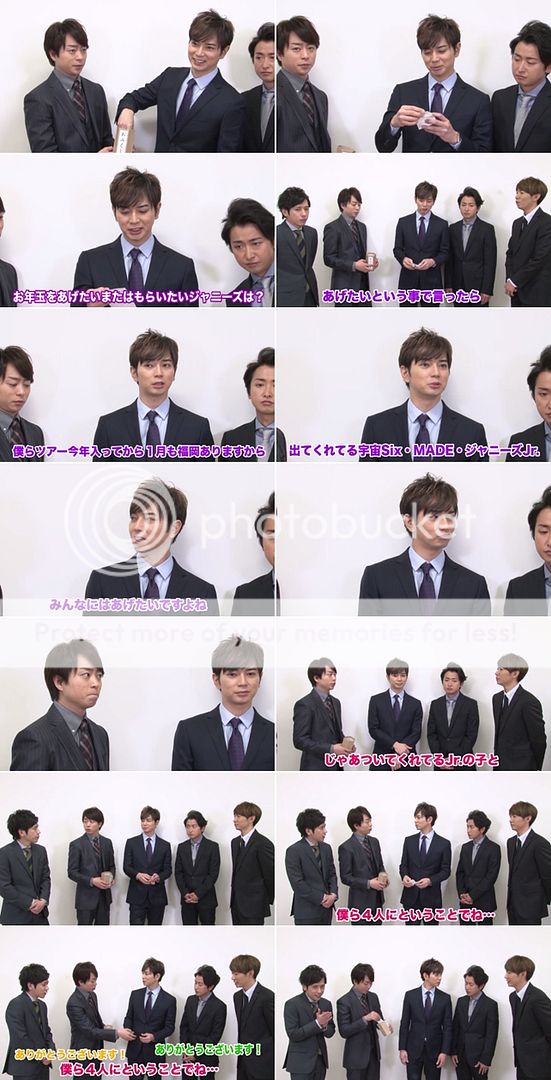 J的おみくじ問題是今年希望給哪位傑尼斯紅包?J說如果是要給紅包,那樣的話就是現在正在tour中,1月還有福岡場,那個時候會出演的Jr有宇宙Six,MADE和傑尼斯Jr,所以會給後輩們。