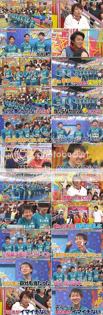 先是青山學院來挑戰。人數這麼多來一起射氣球還是第一次吧。話說翔不愧是主播問了他們關於長跑的事。然後播放了他們的畫面,孩子們還給現場的支持者們簽名什麼的。利達就問他們簽名早就練了?其中一位選手就說他們是贏了之後當晚才開始練習簽名的。大家還剩下7秒時間就射完第一輪的氣球。嵐就說他們贏的很輕鬆吧。有覺得困難,沒射到的人嗎?下田弟弟就說旁邊兩位開始的前10秒一直在說牙白。竹馬就懷疑其實那兩位沒射中吧?結果第二輪可能翔就特別注意那兩位,一結束就站起來問了池田弟弟有沒有射到?池田弟弟心虛應該是沒射到吧。哈哈哈!!太可愛了!!怎麼看都不像4年紀的大學生啊。最後一輪池田弟弟就解釋說自己一直標準某個氣球,結果同時三個箭飛了過去自己應該是有射中吧?