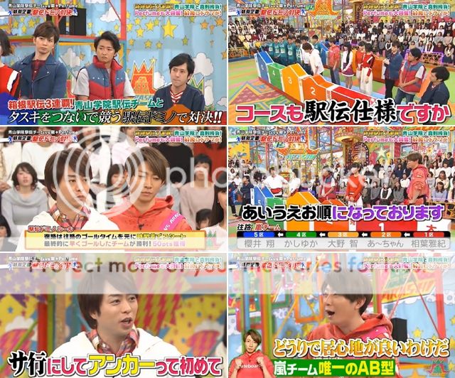 就由我們特別唯一的AB型先開始。超級穩的呀我們雅紀!!一下子就結束了第一棒。第三棒是利達,利達就是手巧,他選擇反方向來放骨牌也沒差,一下就順利結束了。結果到第四棒的香水小姐放的太密集了太小心了所以速度有點慢,交到第五棒翔的時候已經稍微落後了。結果翔最後排完後讓骨牌倒的時候,中間卡住了沒能順利全倒,得重新再排一次。於是嵐隊就落後了1分30秒的時間。原本照規矩應該是要等第二輪開始了1粉30秒後才能開始的嵐隊,卻因為青山的教練表示青山當時在長跑比賽時候也是這樣落後了33秒,所以就放水給嵐隊讓他們遲33秒就可以開始了。說的也是,落後1分30秒,最好最後還能追上啦。