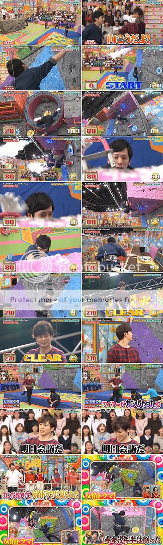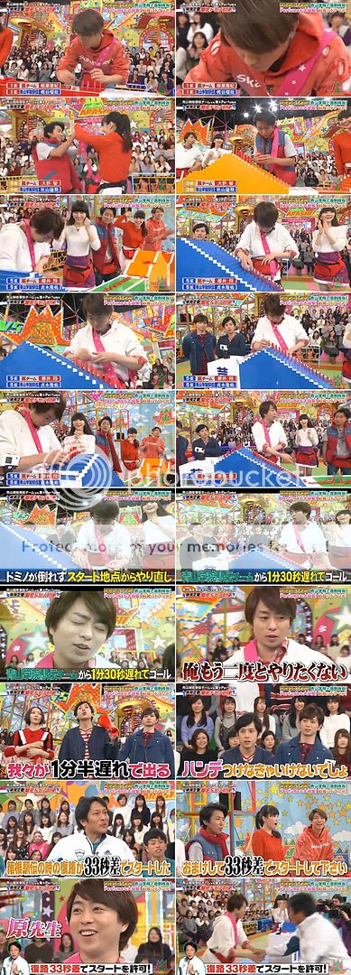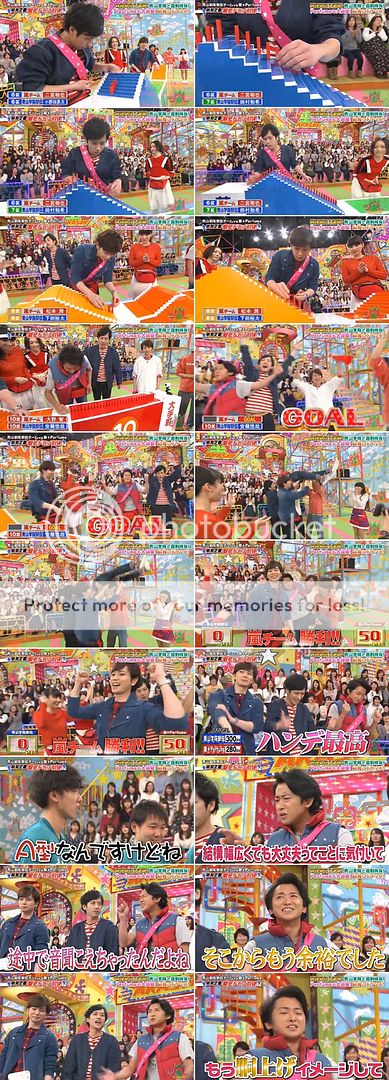 33秒後,開始了!!NINO超專心的。真的左撇子一點阻礙都沒有啊!!很順利的讓斜斜的坡上的骨牌順利全倒了。第三棒是J弟弟。也很順利!!只是稍微還是有點落後了青山選手。不過選手們開始慌了,所以倒的倒,重新來的重新來。反而讓嵐隊有時間追上他們。最後一棒是超級穩的利達,結果青山的最後一棒反而慌了,連倒了兩次骨牌,得重新來過。就這樣利達超輕鬆的獲勝。逆轉勝啊!!!然後門把們真的就把他拋空了。但是這次有好好把他放下來就是了。哈哈哈!