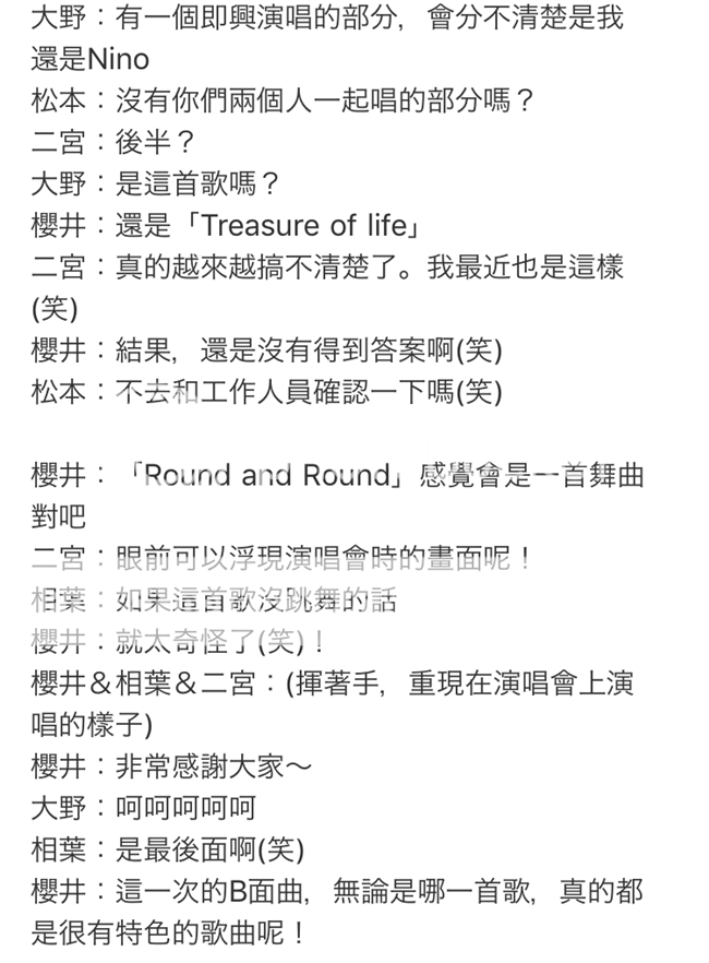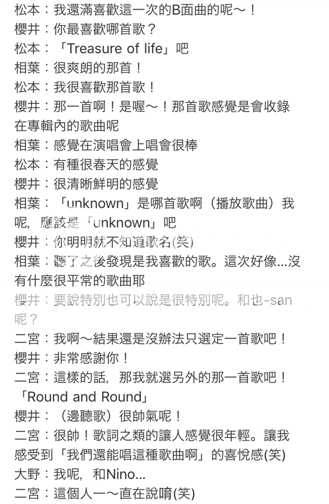 五人選出了各自喜歡的B面歌曲。妮可本人是最喜歡主打和TREASURE OF LIFE!!我果然就是很喜歡這樣的曲風。UNKNOWN那個梗真是老舊啊櫻井翔。哈哈哈!!不過歌曲曲風很特別所以也喜歡。總之這次專輯沒有不喜歡的!!